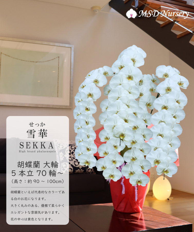 胡蝶蘭 花持ち長い 純国産 大輪5本立ち 70輪~ 【雪華(せっか)白】 画像配信あり 産地直送 お祝い プレゼント 花 ギフト 贈り物 お供え お誕生日 開店祝い 開業祝い 移転祝い 就任祝い 昇進祝い 当選祝い 当日発送 王立園芸協会登録商品