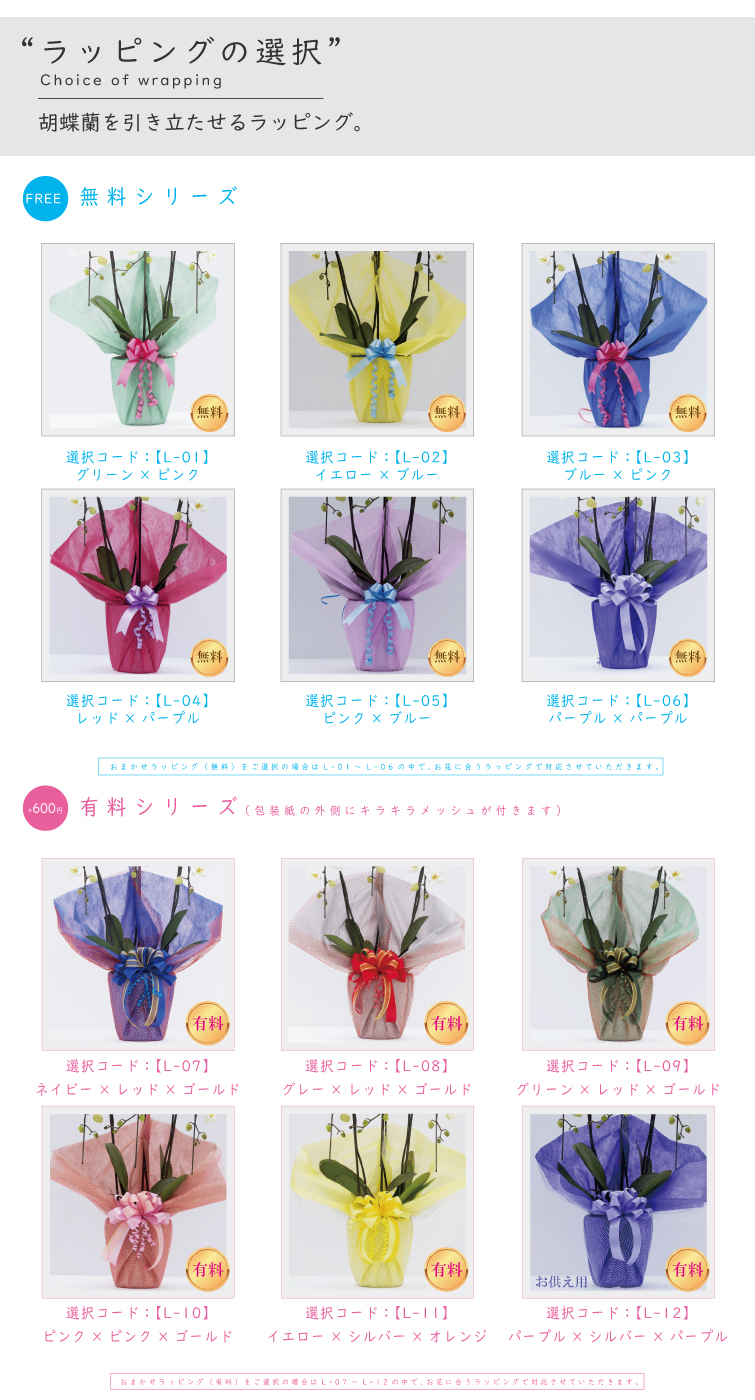 ラッピング、立札、メッセージカードのお好みのデザインの「選択コード」をお選び下さい。