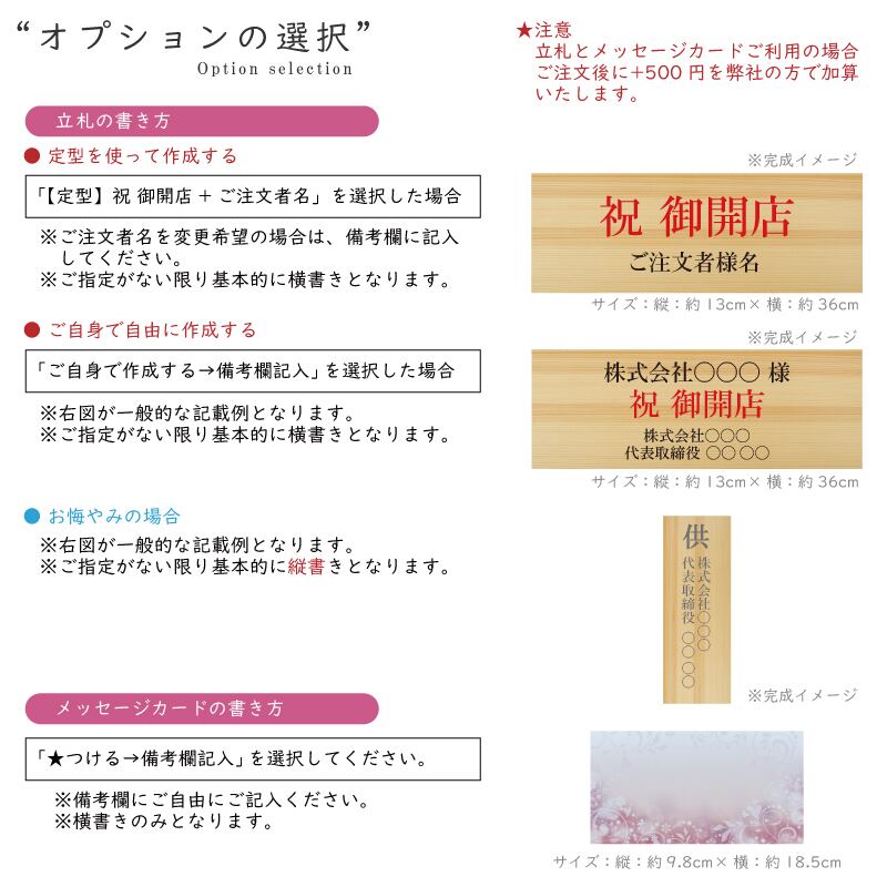 ラッピング、立札、メッセージカードのお好みのデザインの「選択コード」をお選び下さい。