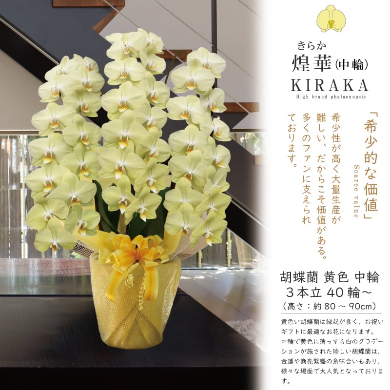 《開花中》純国産 胡蝶蘭 中輪 3本立ち 40輪~ 希少 【煌華(きらか)中輪 黄色】 産地直送 花持ち長い 画像配信あり 喜寿胡蝶蘭 お祝い ギフト 贈り物 お誕生日 長寿祝い 開店祝い 開業祝い 移転祝い 就任祝い 昇進祝い 当選祝い 日本橋 銀座 王立園芸協会登録商品